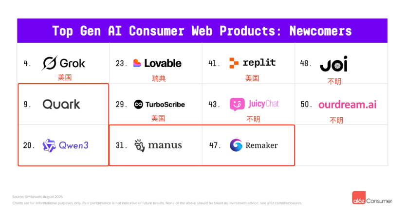 上圖中的“Qwen3”指的是阿里推出的ChatBot 產(chǎn)品「通義」,海外版為「Qwen」,a16z 使用“Qwen3”容易與阿里旗下模型名稱混淆,所以下文均使用「Qwen」指代該產(chǎn)品而 Web 端的變動相對 App 端小一些,新上榜了 11 款產(chǎn)品,其中,來自華人團隊的產(chǎn)品有 4 款,其中包括從 3 月“火”到現(xiàn)在的 Manus,來自阿里的兩款產(chǎn)品 Quark 和 Qwen,以及一款專注于圖像視頻領域的 Remaker(團隊應該分布在北京和中國香港兩地)。