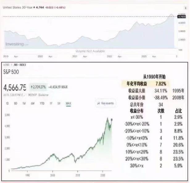 如果以保險公司投資美國市場做假設(shè),我們一起看一下收益率達到6%-7%的可能性?固定收益類:假設(shè)投資美國30年期國債收益率,現(xiàn)行利率4.75%,取一個低值以收益率4%計算;權(quán)益類資產(chǎn):假設(shè)投資標普500的實際收益率,從1990年開始計算平均收益率7.82%;