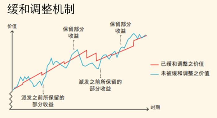 3. 緩和調(diào)整機制 在保險資金的投資組合中,因為包含了權(quán)益類資產(chǎn),且市場本身就存在各種風險,所以投資收益可能會存在不可預(yù)測的波動,而這種波動勢必會影響投資收益的穩(wěn)定性因此,香港保險公司采用了一種調(diào)整機制來平滑收益。